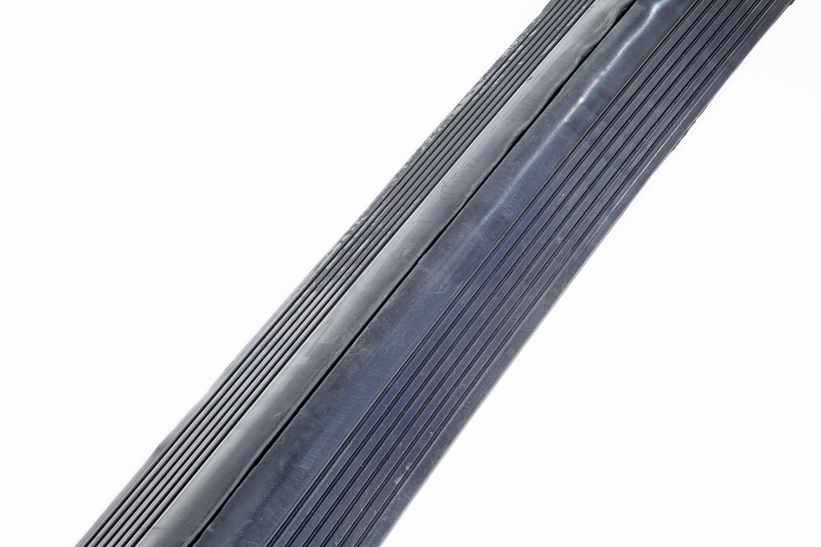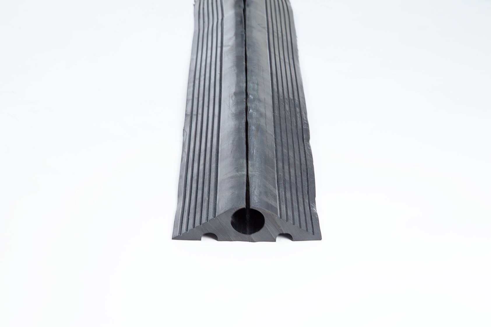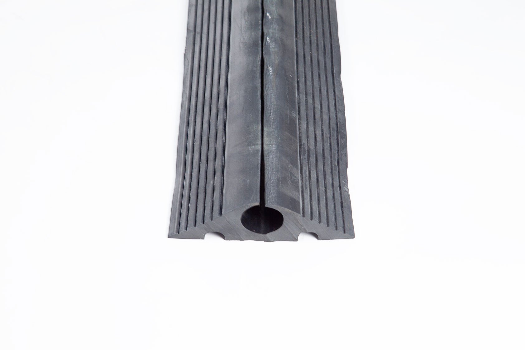 1 channel heavy duty cable protector Cable going through the rubber cable protector Rolled cable protector Underneath of the rubber cable protector Cable inside rubber cable protector snap open design Side view of cable protector Front view of cable protector Cable protector large channel size