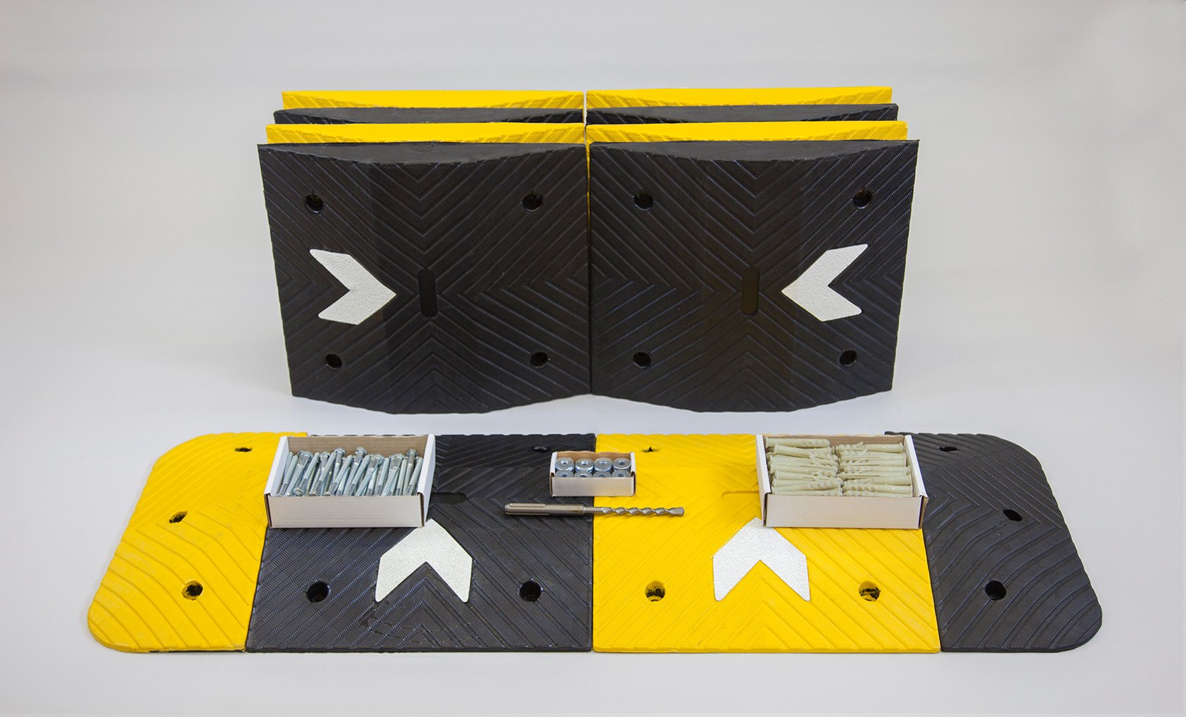 - With a light reflective chevron on each middle section showing direction flow these speed bumps are highly visible at night
