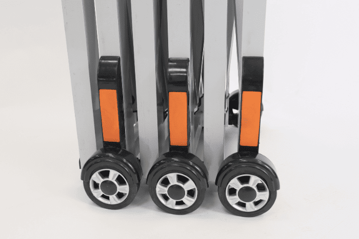 expandable barrier side profile closed barrier closed barrier opened angled barrier close up of wheels close up of reflectors close up of wheels view of the bottom of barrier open view of barrier Aluminium expandable safety barrier on wheels Aluminium Expandable Safety Barrier (Expands to 2.1m) Key to lock barrier