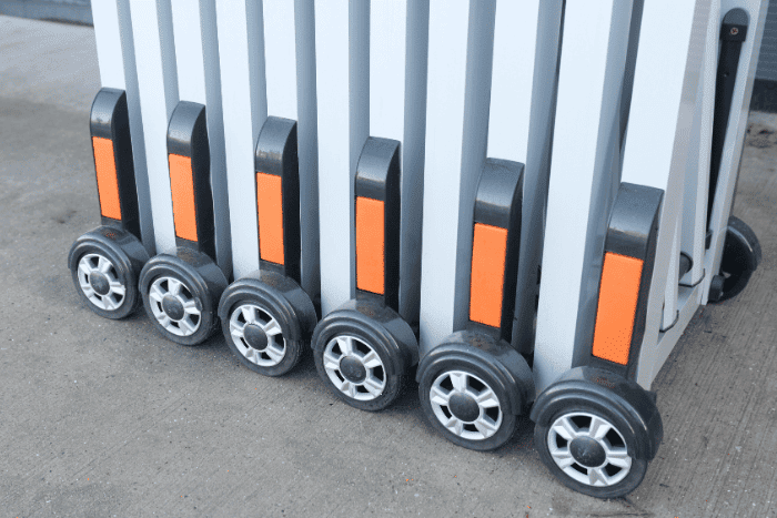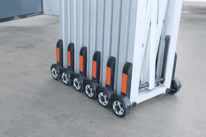 Enhance safety across commercial sites with the 1.8m high Aluminium Heavy-Duty Expandable Barrier. Provided on wheels for quick and easy to deployment,  the concertina barrier allows you to section off areas and restrict pedestrian access.