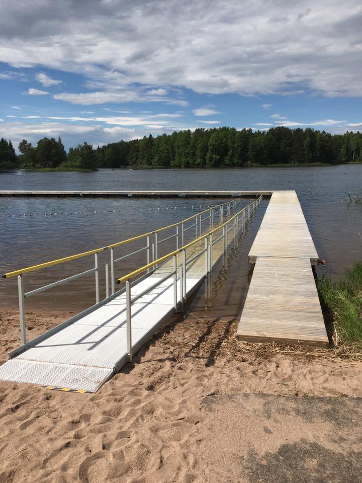 Technical drawing of modular ramp Technical drawing of modular wheelchair ramp Aluminium modular wheelchair ramp Fully assembled modular wheelchair ramp Aluminium Modular Ramp Kit with Platform and Handrails - 1300mm x 1500mm ramp section Modular wheelchair ramp in water Modular ramp in front of building