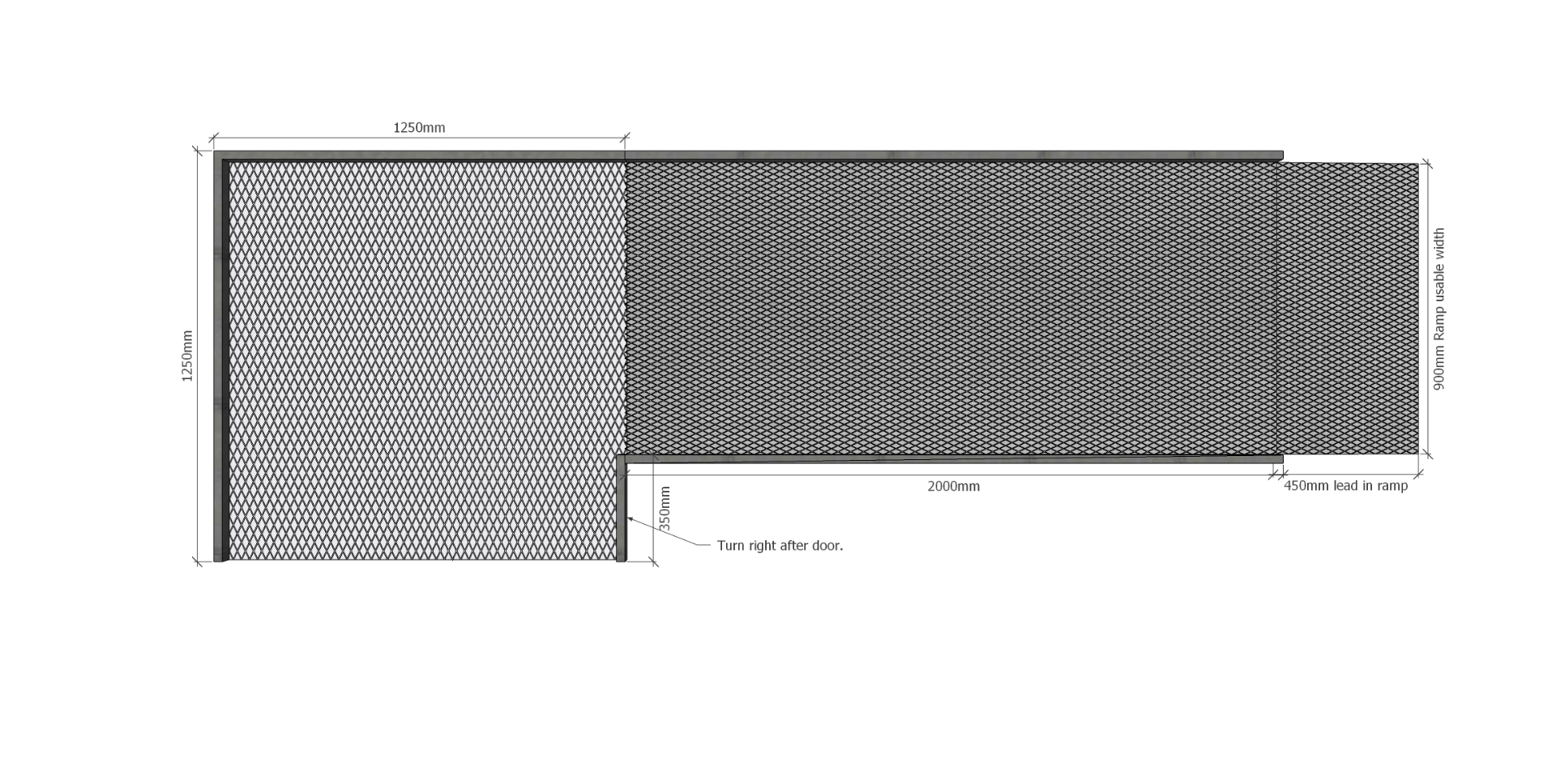 Modular Ramp System, 2000mm long ramp section, 900mm ramp usable width, with double height handrails and mesh anti-slip surface.