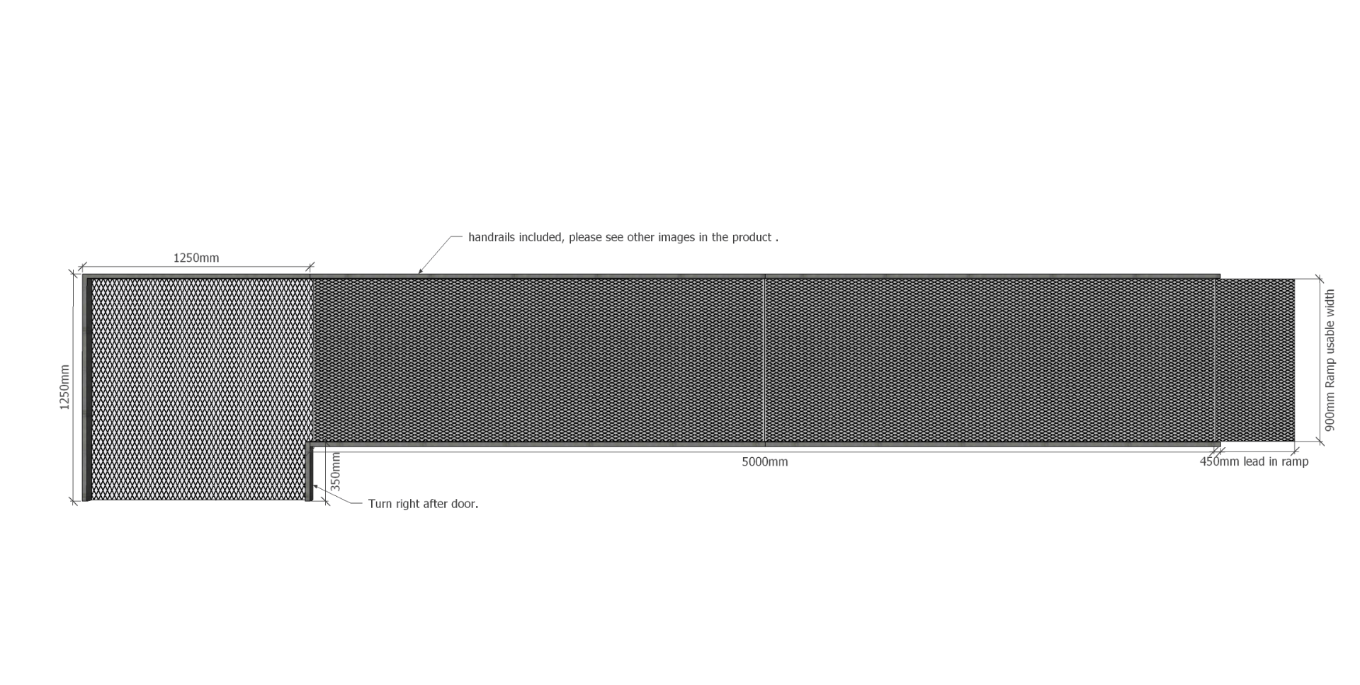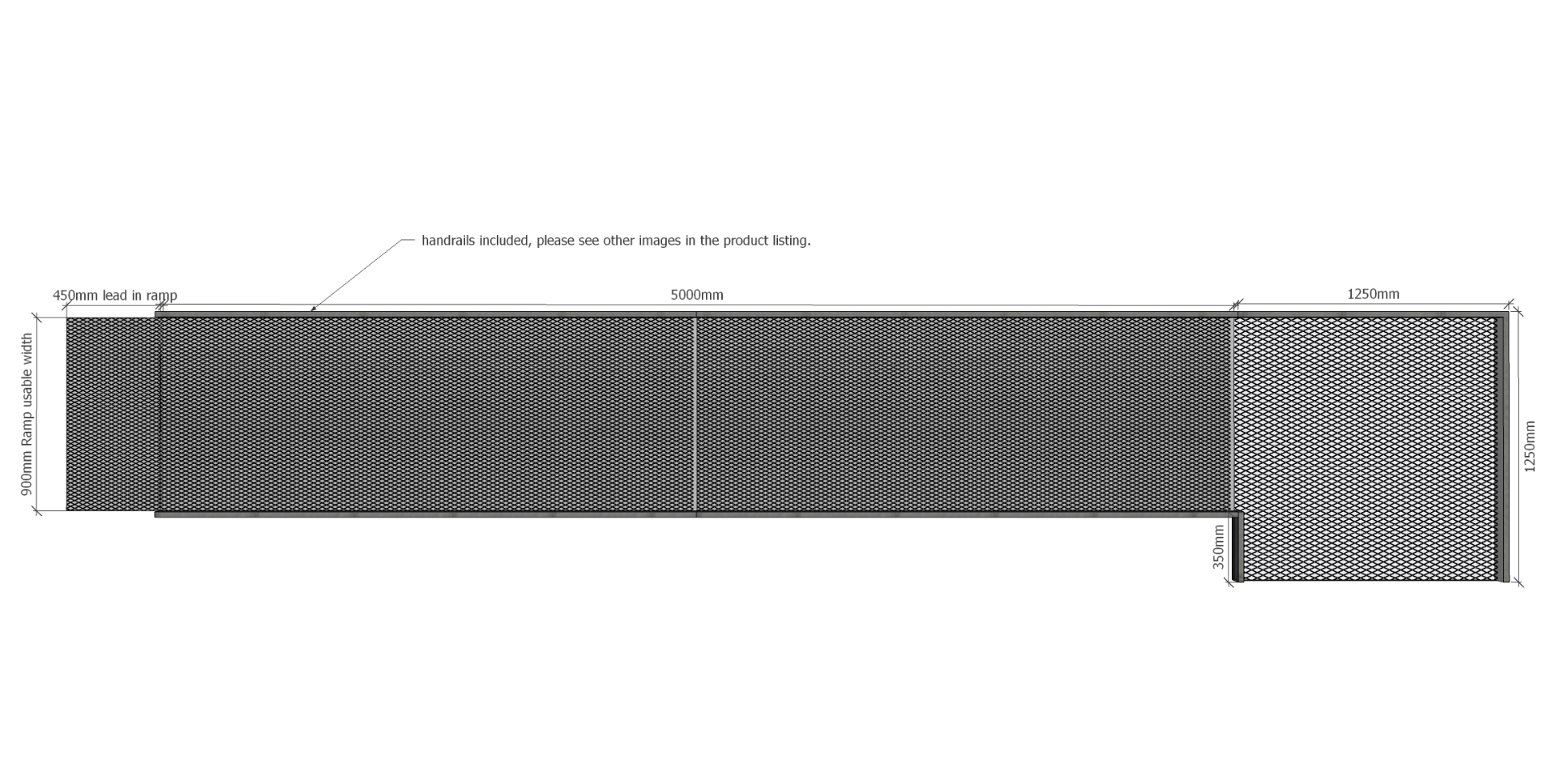 Modular Ramp System, 5000mm long ramp section, 900mm ramp usable width, with double height handrails and mesh anti-slip surface.
