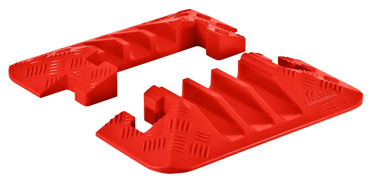 Use the 3-Channel Heavy Duty Linebacker® End Caps with Linebacker® 3-CHANNEL CABLE PROTECTOR with hinged lid. Provides a safe crossing for vehicles and pedestrian traffic while protecting valuable electrical cables and hose lines from damage in extreme weather conditions and work environments. Modular interlocking design is ideal for use in oil and gas applications, mining, military, and other industrial environments with heavy trucks and forklifts for cables up to 2.25" tall and 2.25" wide.