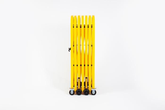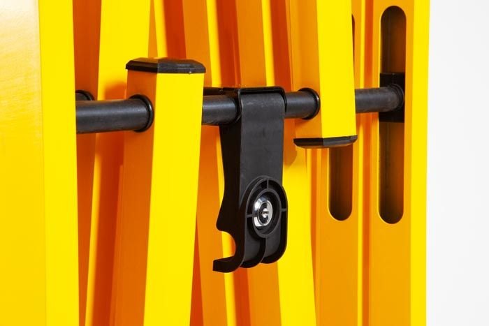Heavy duty concertina barrier on wheels Yellow expandable safety barrier on wheels Compact stored yellow barrier on wheels Expandable safety barrier on wheels Interlocking safety barrier with key Interlocking yellow safety barrier Yellow safety barrier close up Stored yellow safety barrier