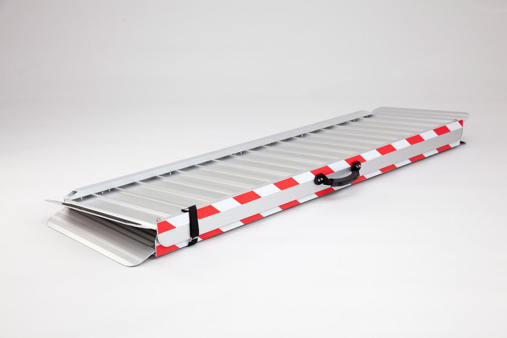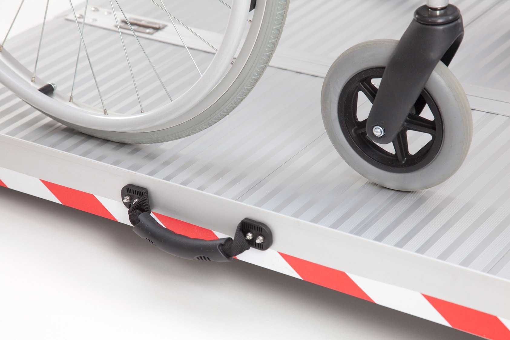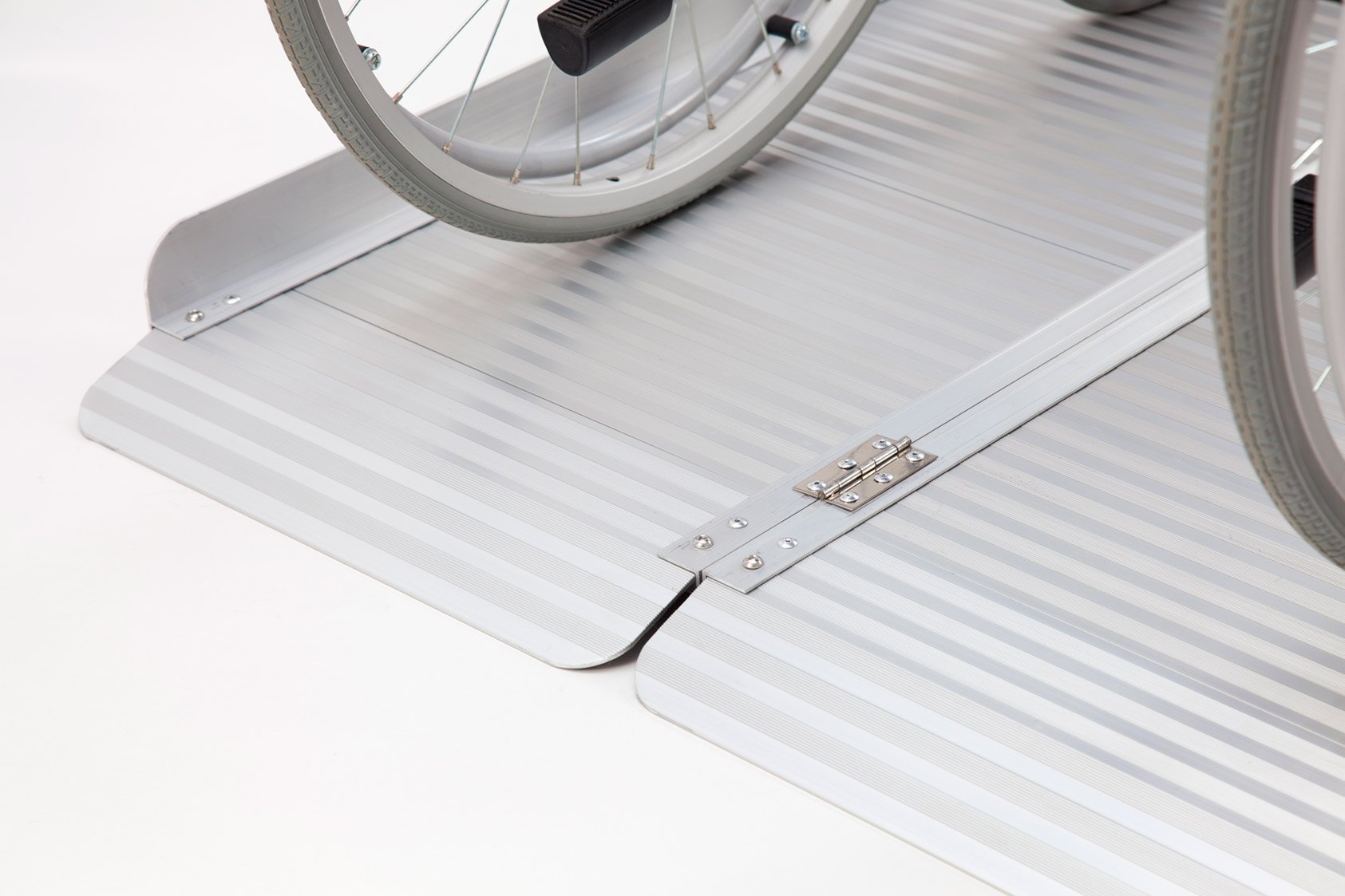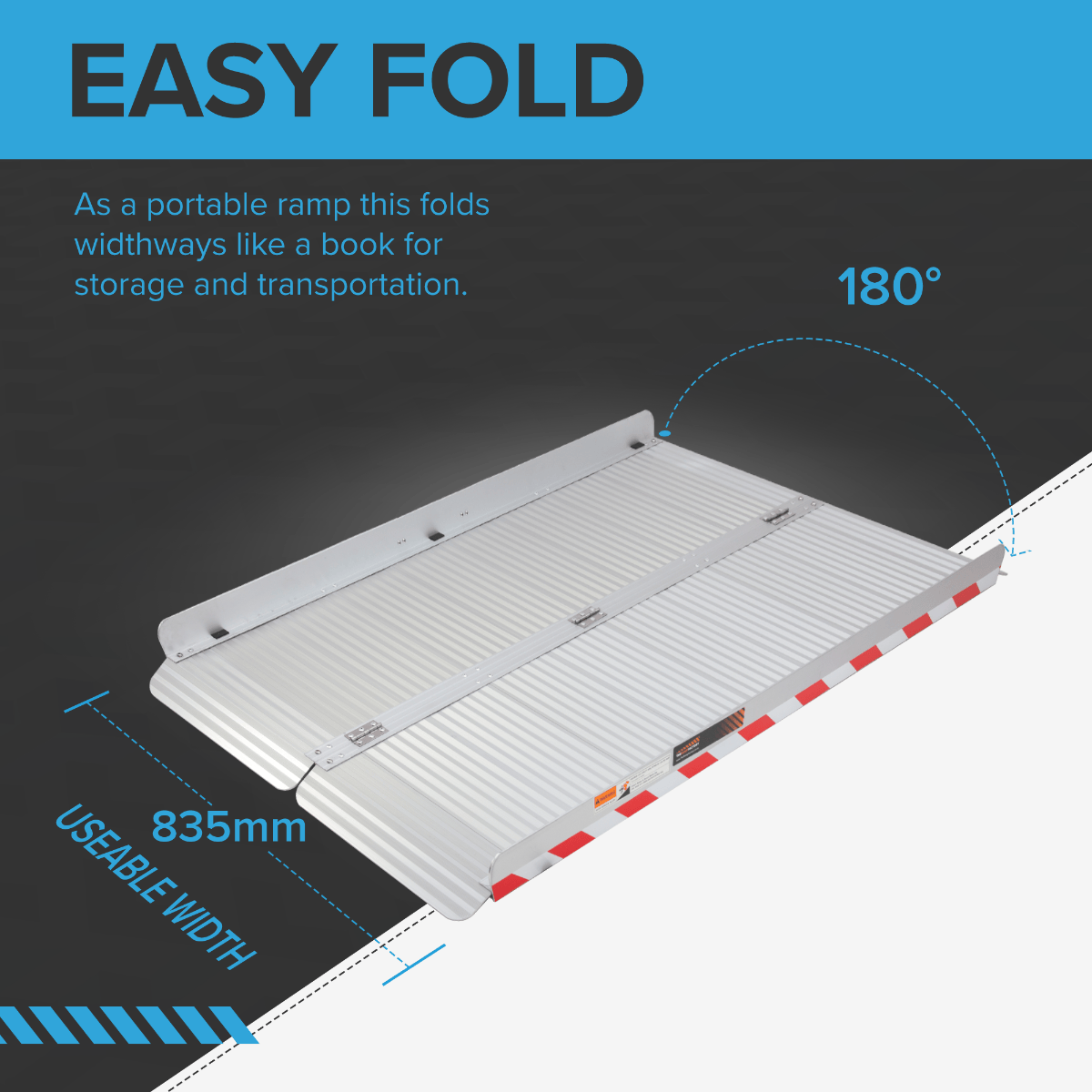 Lightweight folding wheelchair ramps that provide wheelchair access over any kerb or step, choose from 2ft, 3ft, 4ft, 5ft, 6ft, 7ft & 8ft lengths. With weights starting at just over 5.5kg, this disabled access ramp/suitcase ramp can be easily folded horizontally during transport. Internal width 835mm and total width 850mm.
