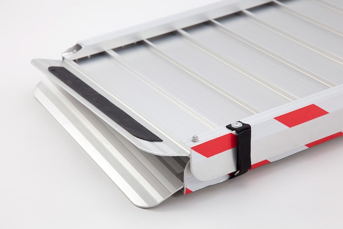- Folding wheelchair ramp design for easy storage and transport, clips shut when stored