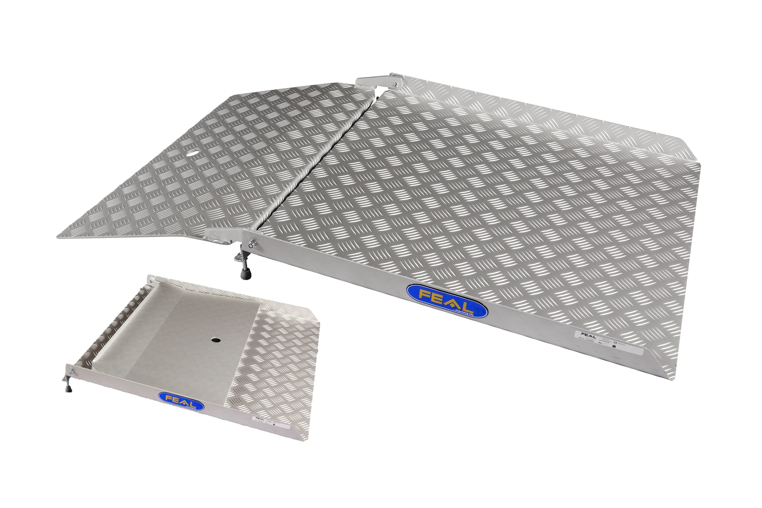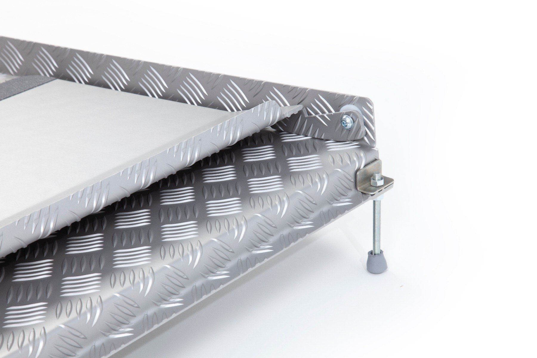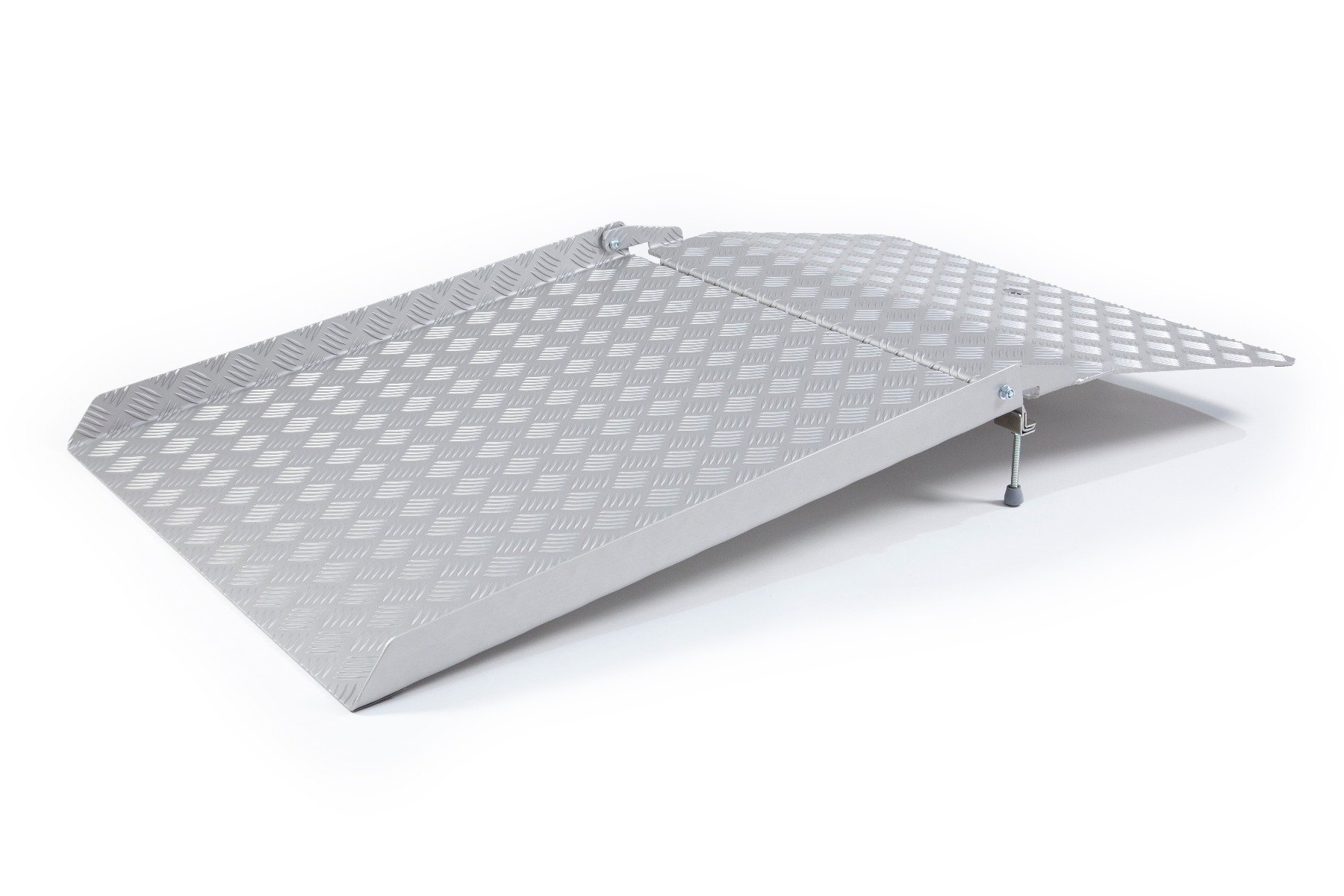 This folding drive-in ramp is designed to act as a bridge to allow users to overcome thresholds of up to 80mm. The design allows users to adjust the ramp legs to the required height and go up and over the threshold. After use, the entry plate can be flipped back onto the ramp to allow users to close the door whilst leaving the ramp in place.