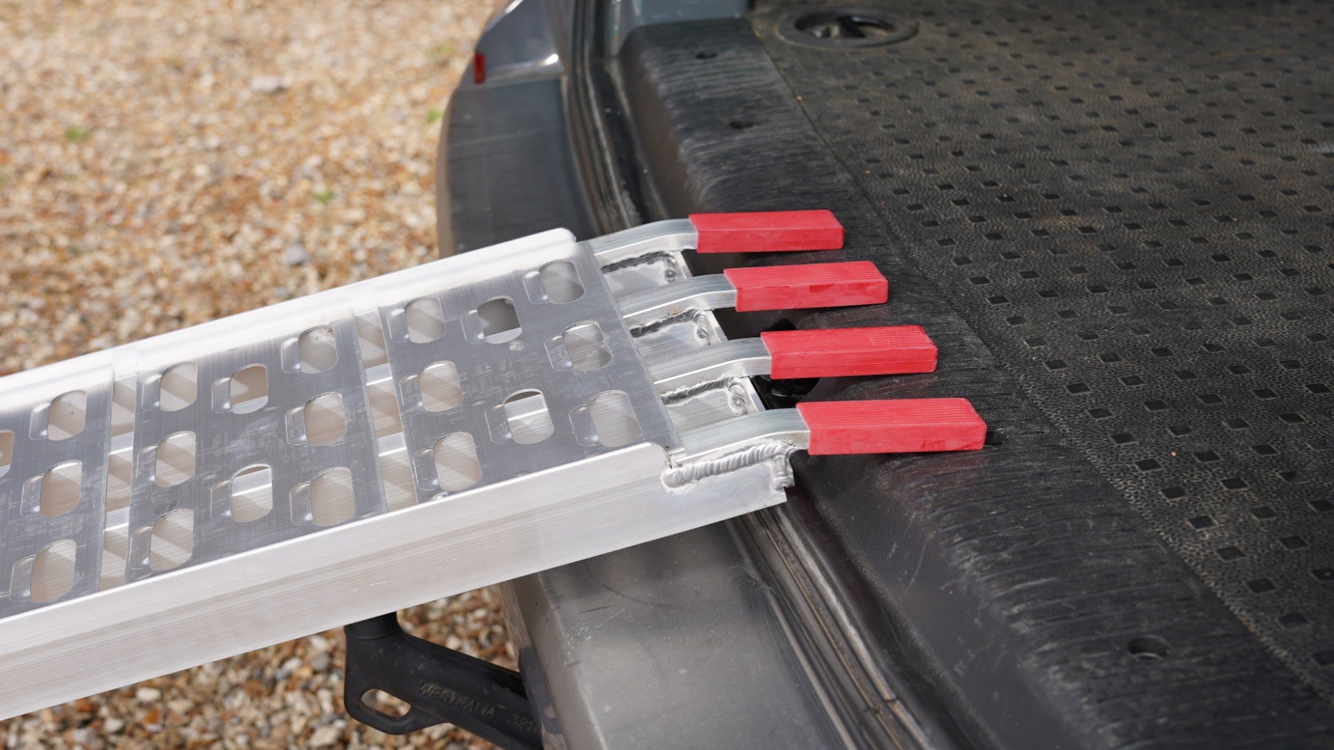 The ramps use a rest on connection which is either red prongs or a solid lip (depending on model) which rests onto the surface you are loading onto. Straps are provided with our folding motorbike ramps which can be used to secure the ramps in place during loading. The motorbike ramps offer an angled foot to ensure they sit securely on the ground during loading. The rest on connection is suitable for flat bed vehicles such as transit vans and trailers, they can also be used to overcome steps.