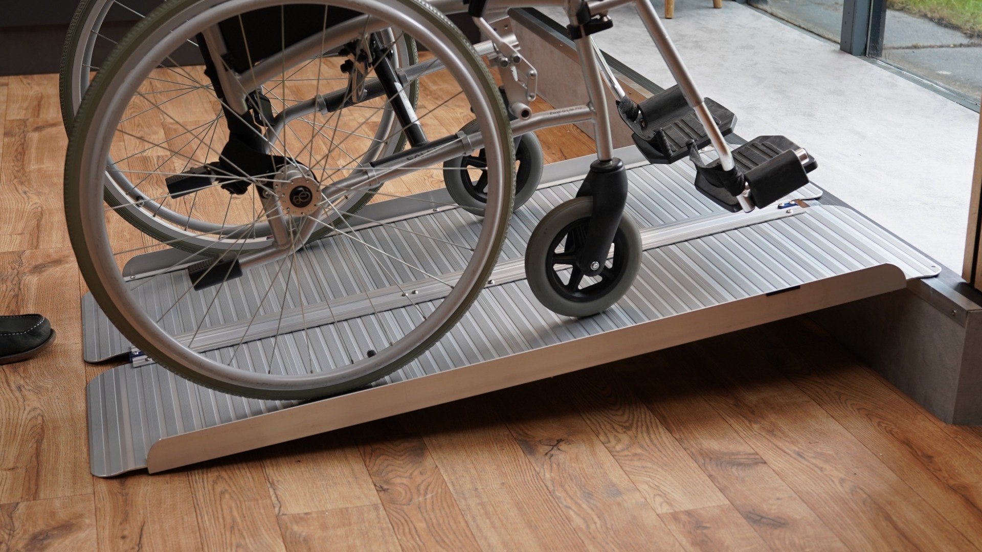 Aluminium folding 3ft wheelchair ramp that provide wheelchair access over kerbs and steps, perfect for disabled access. Maximum gradient = 1 in 6 although 1 in 8 is recommended. Provided with safety edges. Internal width 715mm and total width 720mm.