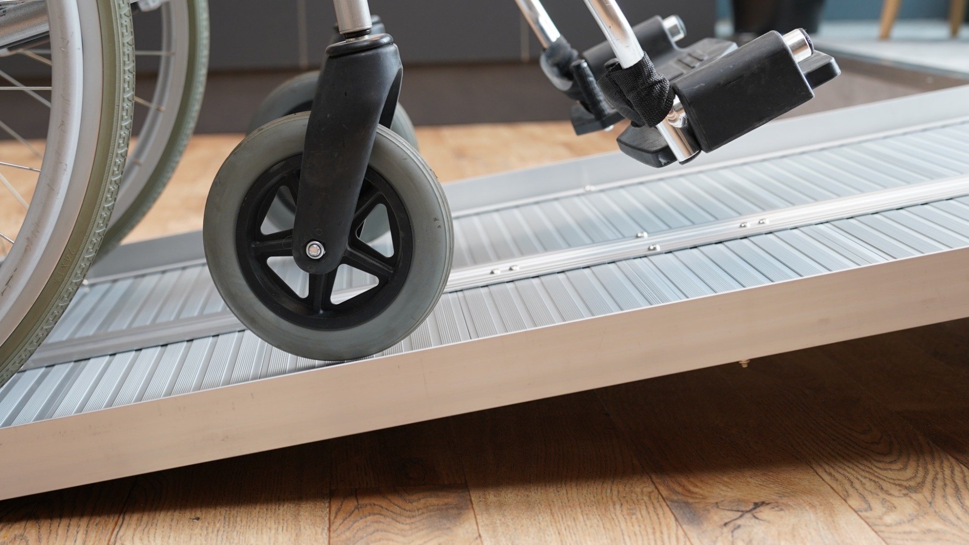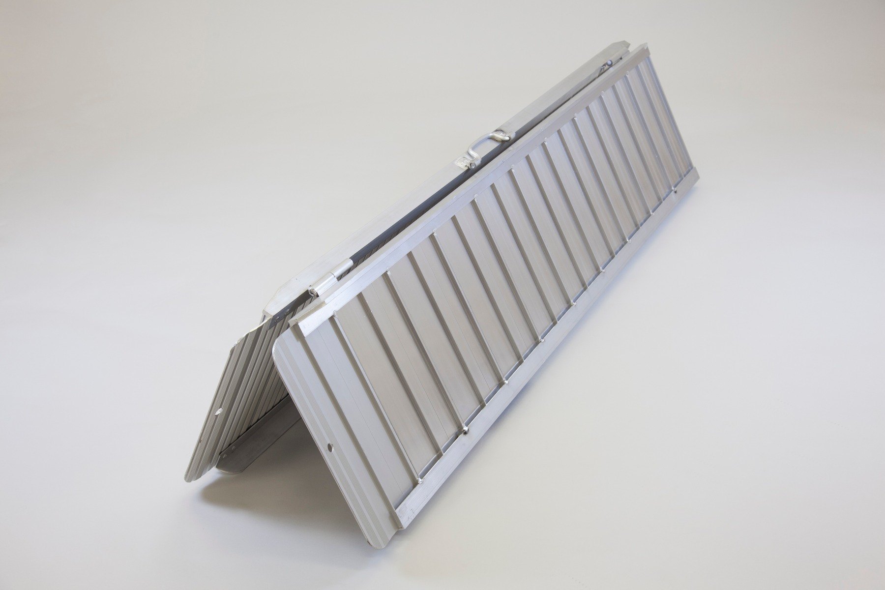 Aluminium folding 6ft wheelchair ramp that provide wheelchair access over kerbs and steps, perfect for disabled access. Buy VAT exempt. Maximum gradient = 1 in 6 although 1 in 8 is recommended. Provided with safety edges. Internal width 715mm and total width 720mm.