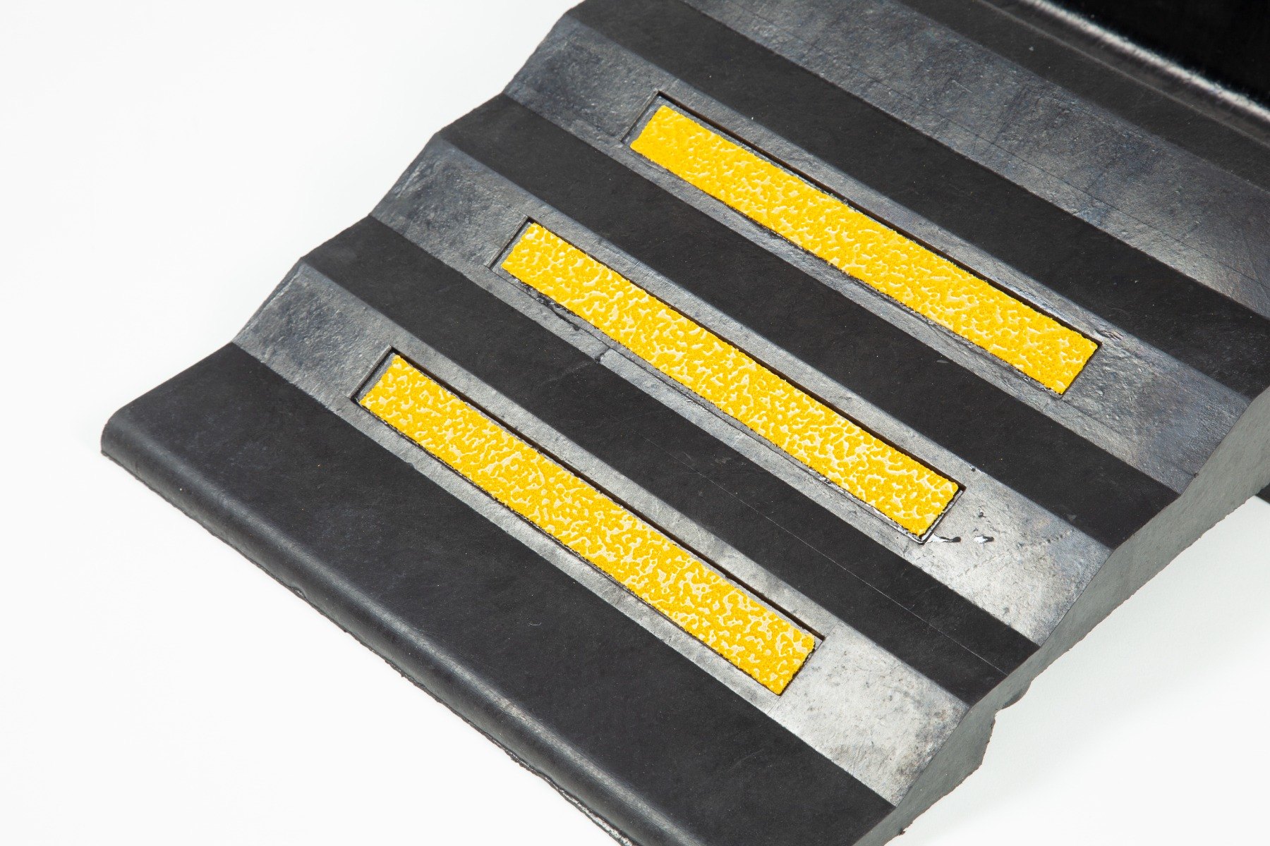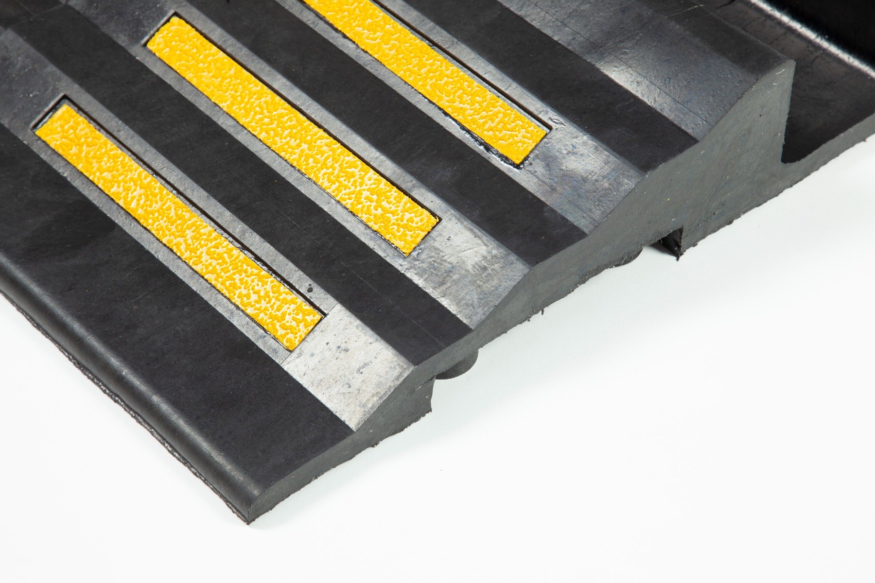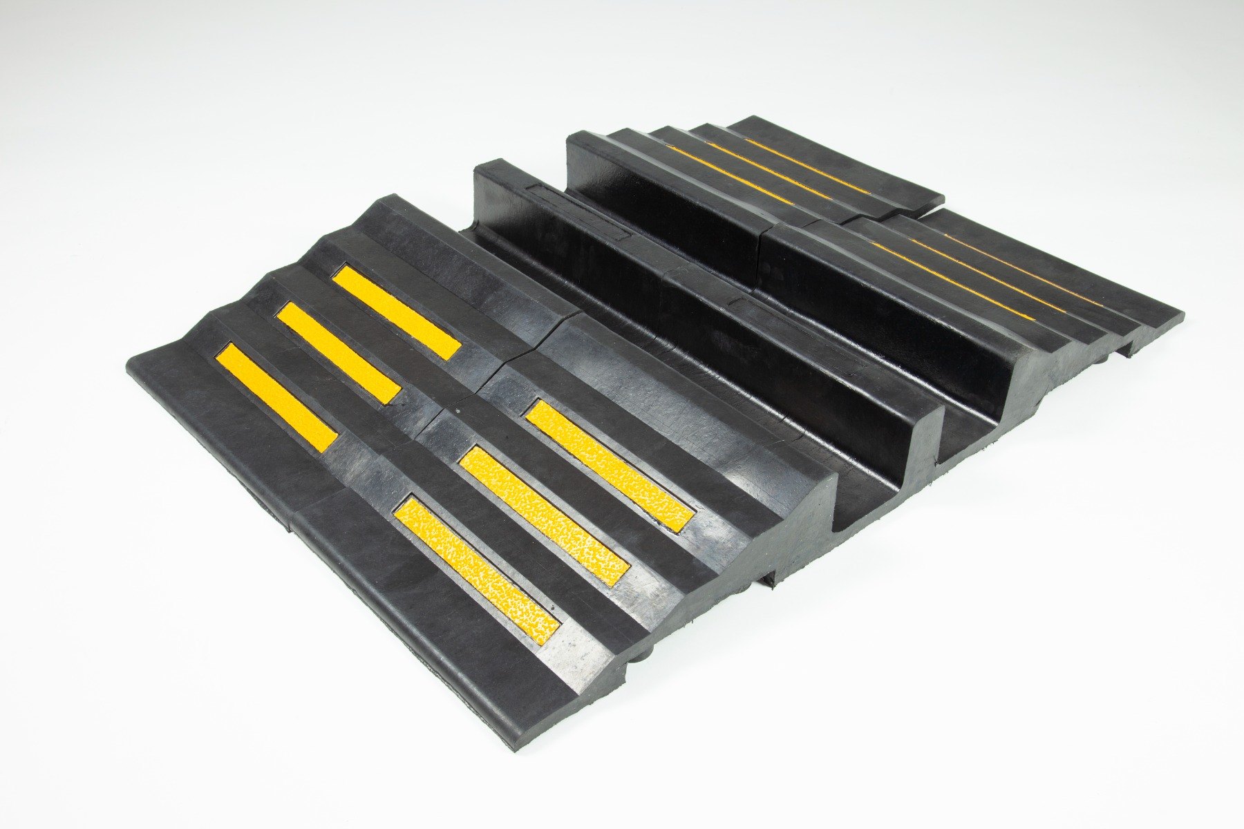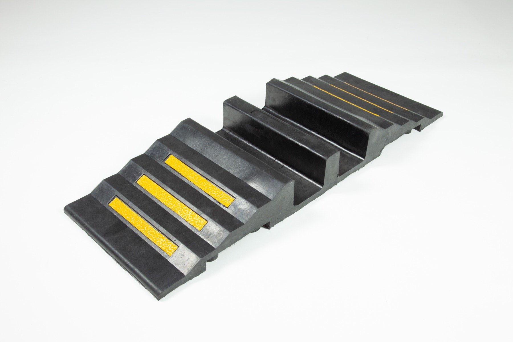 TRP-HR series hose ramps allow vehicles weighing up to 20,000kg per axle to safely and smoothly transition over two master stream or supply lines. The hose protector ramp directs vehicle tires over the hose line to a center support, then over the second hose line back to the road surface. Each hose ramp can be placed side by side and fixed together with the included connectors, perfect for protecting longer sections of hose. Includes integrated safety yellow reflective strips on both sides for either approach. Ideal for fire engines and fire protection vehicles with supply lines or master stream systems in high traffic areas.