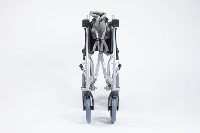 The wheelchair is designed to be quick and easy to fold. Simply grab the centre of the front and rear edges of the seat sling. For more compact storage the backrest can also be folded and the rear wheels can be removed using the quick release button. The footrests can also be removed or swung away. View the user guide for more details.