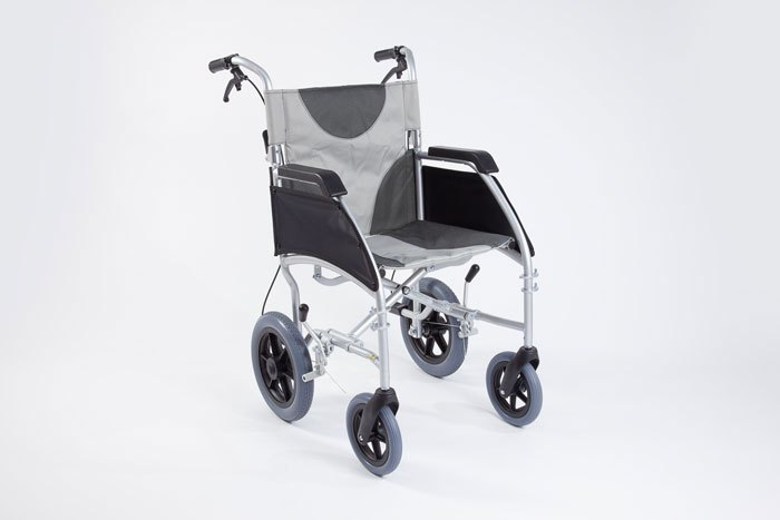 Aluminium lightweight folding transit wheelchair by Drive DeVilbiss offers a 115kg capacity with superior safety and comfort features. It includes parking and cable brakes for secure positioning, push handles with a brake lever for easy maneuvering, and adjustable footrests with five positions. The footrests can also be swung away when needed. Long-reach brakes on the rear tyres are accessible by both the user and attendant. For convenience, the wheelchair folds for easy storage and transport, with a wipe-clean soft-touch seat and side panel for safety. The wheelchair also includes a rear pocket for easy storage.