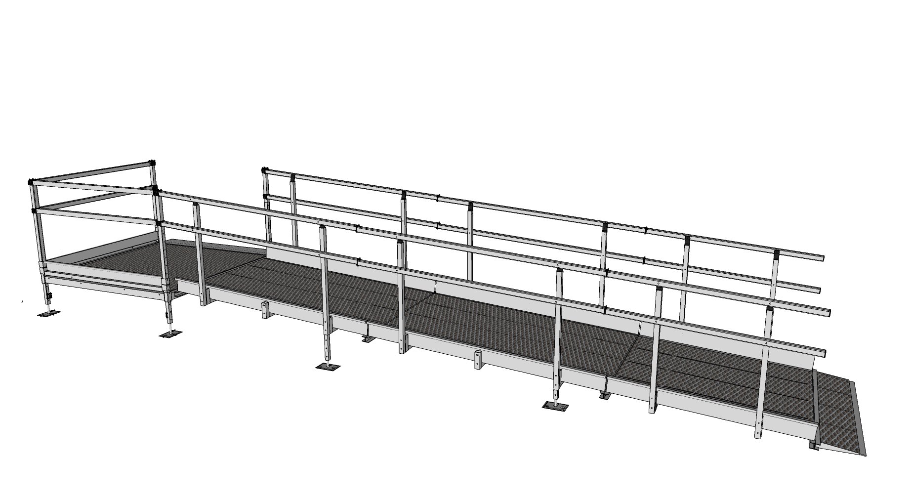 Modular Wheelchair Ramp System, 5200mm long plus 300mm lead in ramp, 1500mm wide, internal width 1276mm, with double height handrails, platform and mesh anti-slip surface.