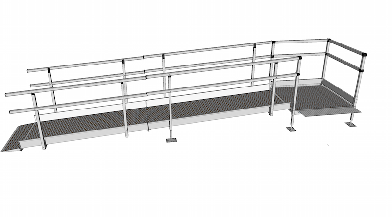 Modular Ramp System, 6000mm long plus 300mm lead in ramp, 1500mm wide, internal width 1276mm, with double height handrails, platform and mesh anti-slip surface.