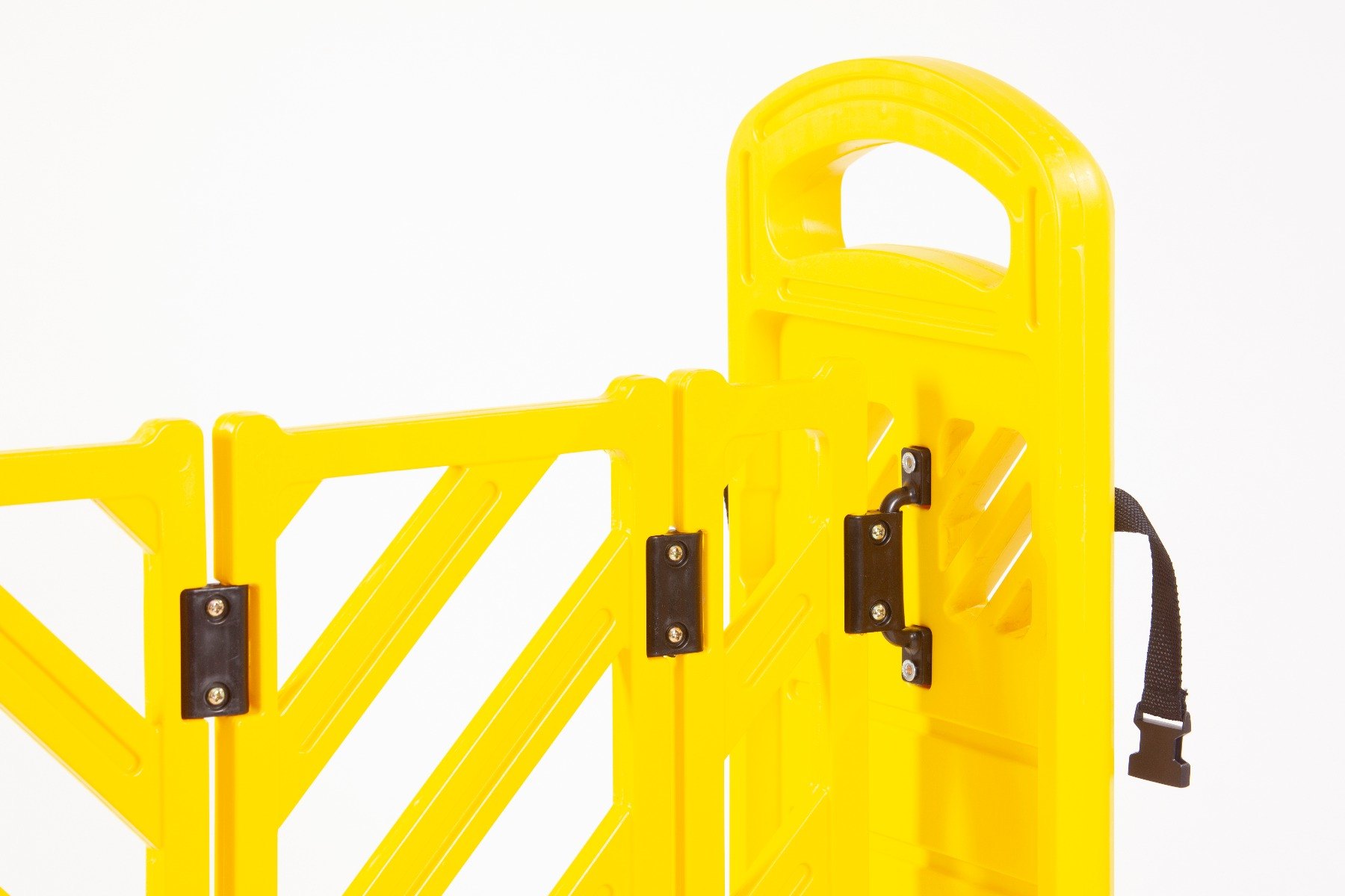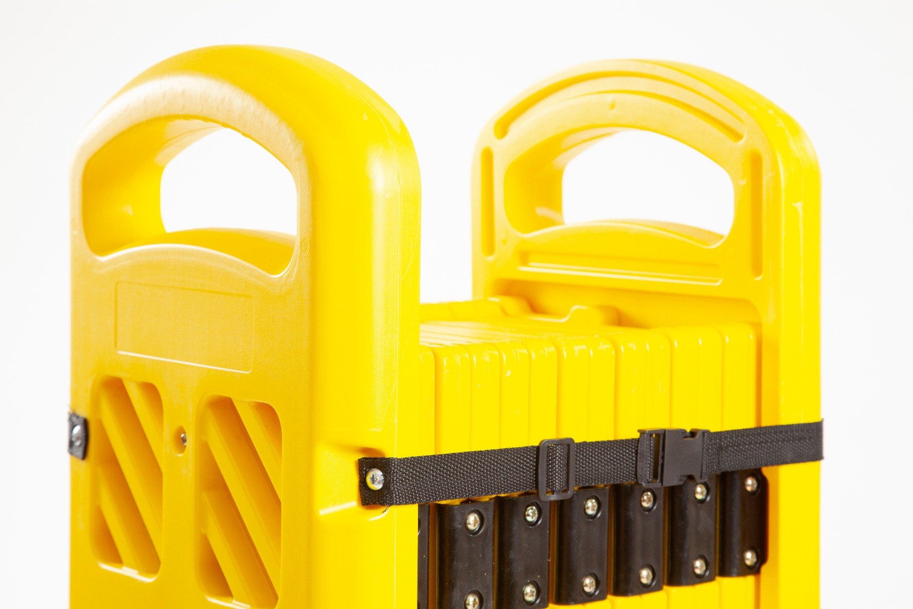 Yellow expandable safety barrier Yellow safety barrier with warning signs Portable expandable barrier stored for transportation Stored portable plastic safety barrier Compact safety barrier Wheels on the portable safety barrier Wheels on safety barrier Stood up mobile safety barrier Clip shut safety barrier Handles on safety barrier Yellow safety barrier in use Warning barrier in a warehouse