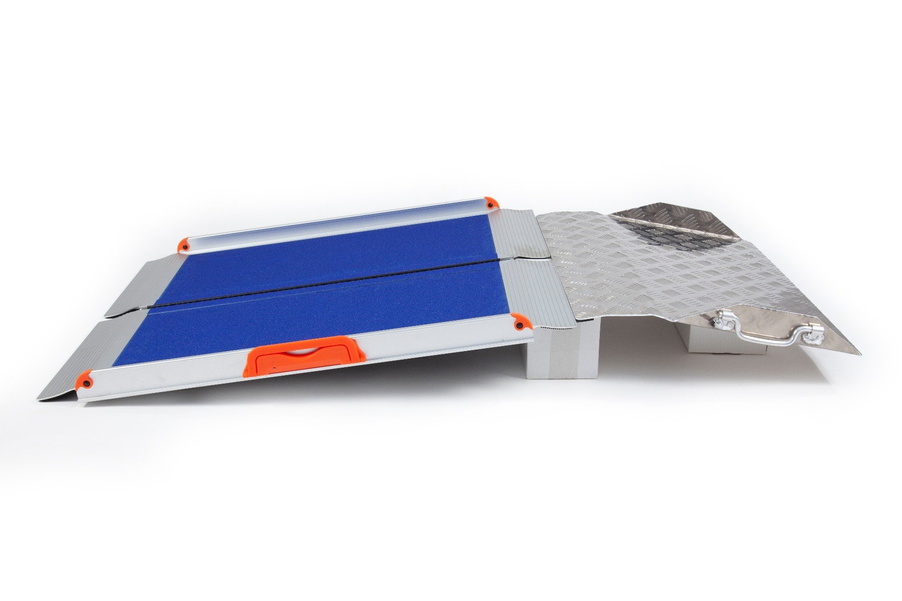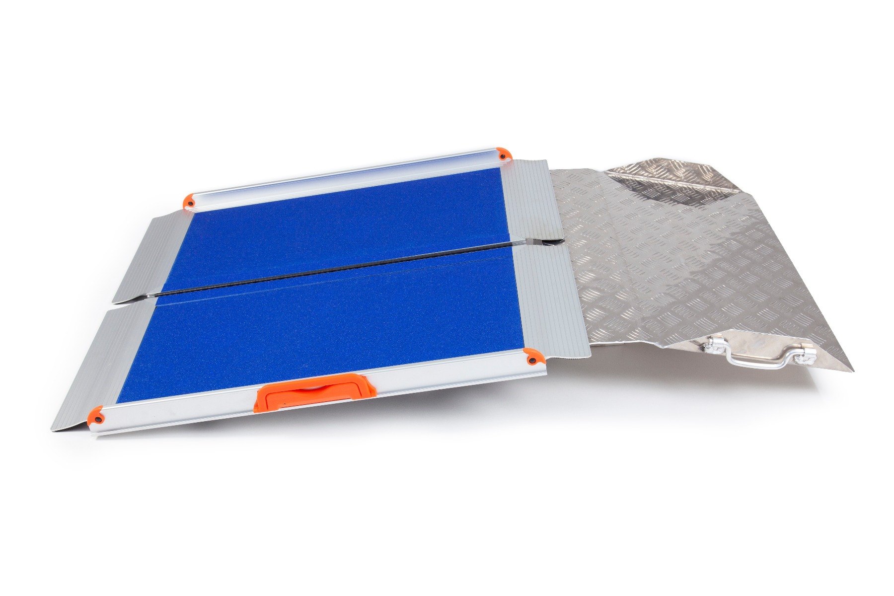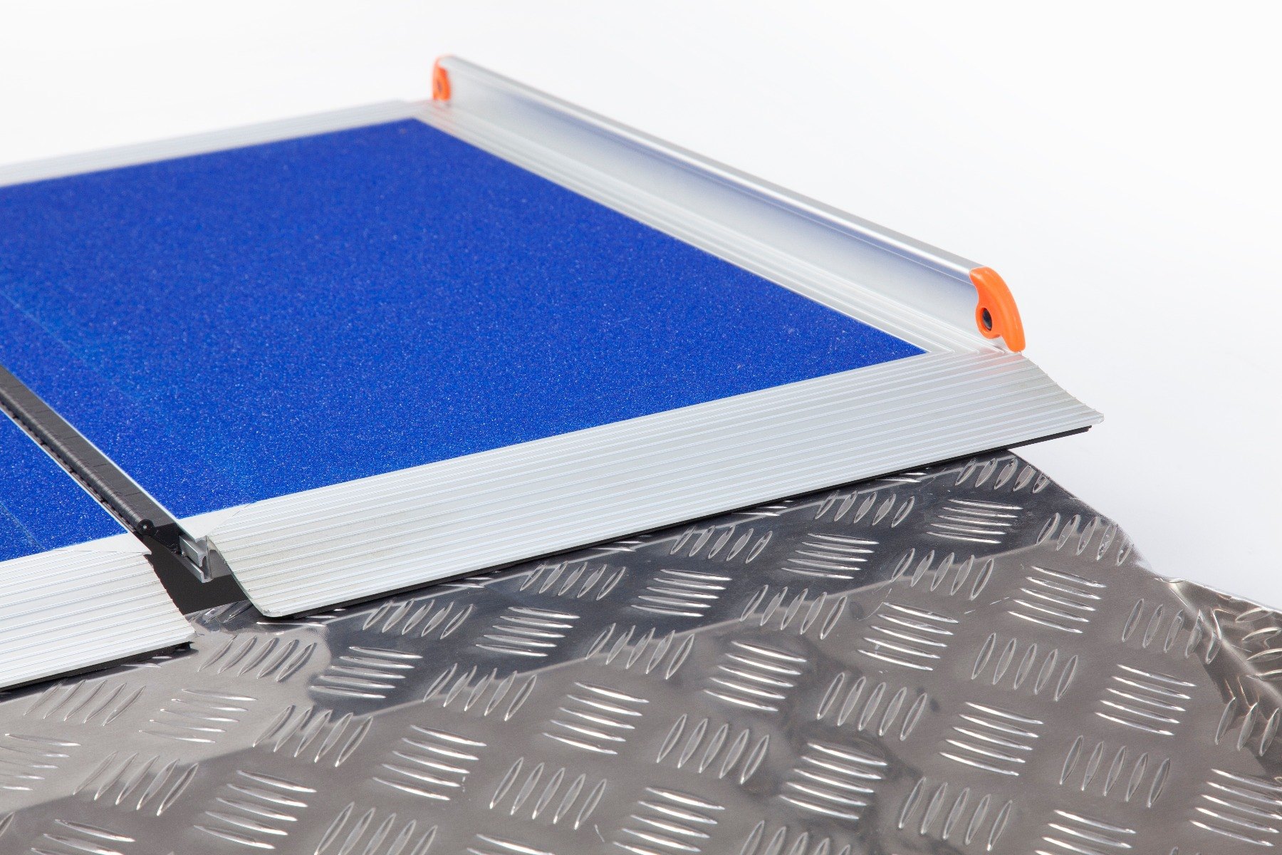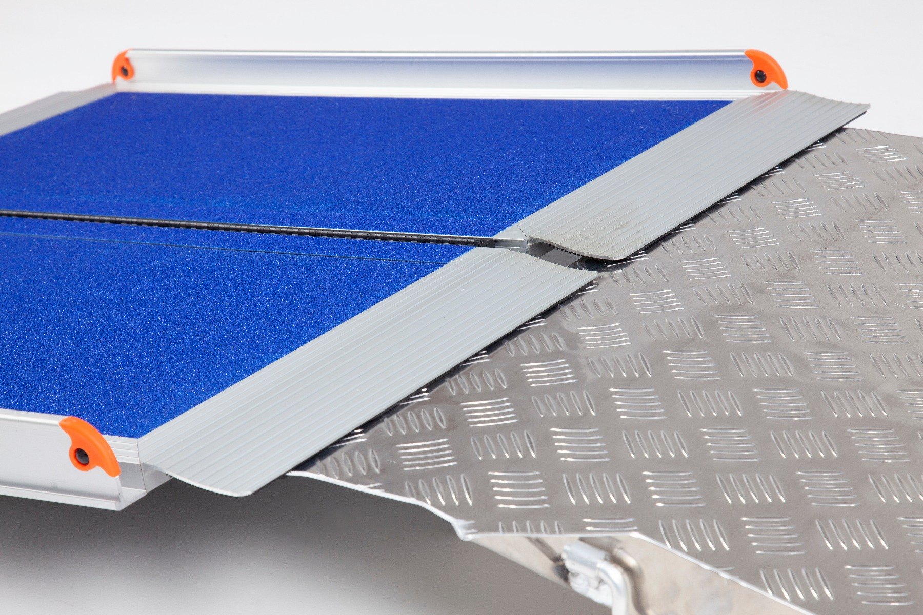 Premium length fold wheelchair TRP-XL ramps are available in 2ft, 3ft, 5ft and 6ft lengths. Manufactured with a single fold down the length of the ramp, this disabled access ramp also features a durable blue non-slip surface and carry handles for ease of transport and rubber anti-slip under the connection to safely use as a kit.