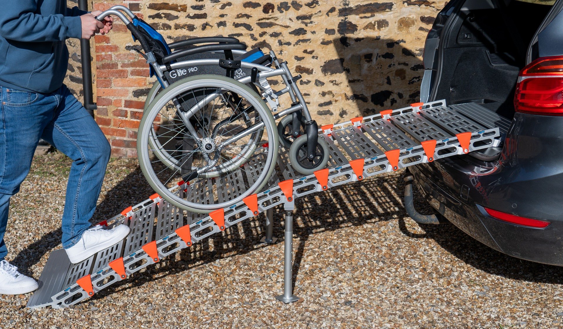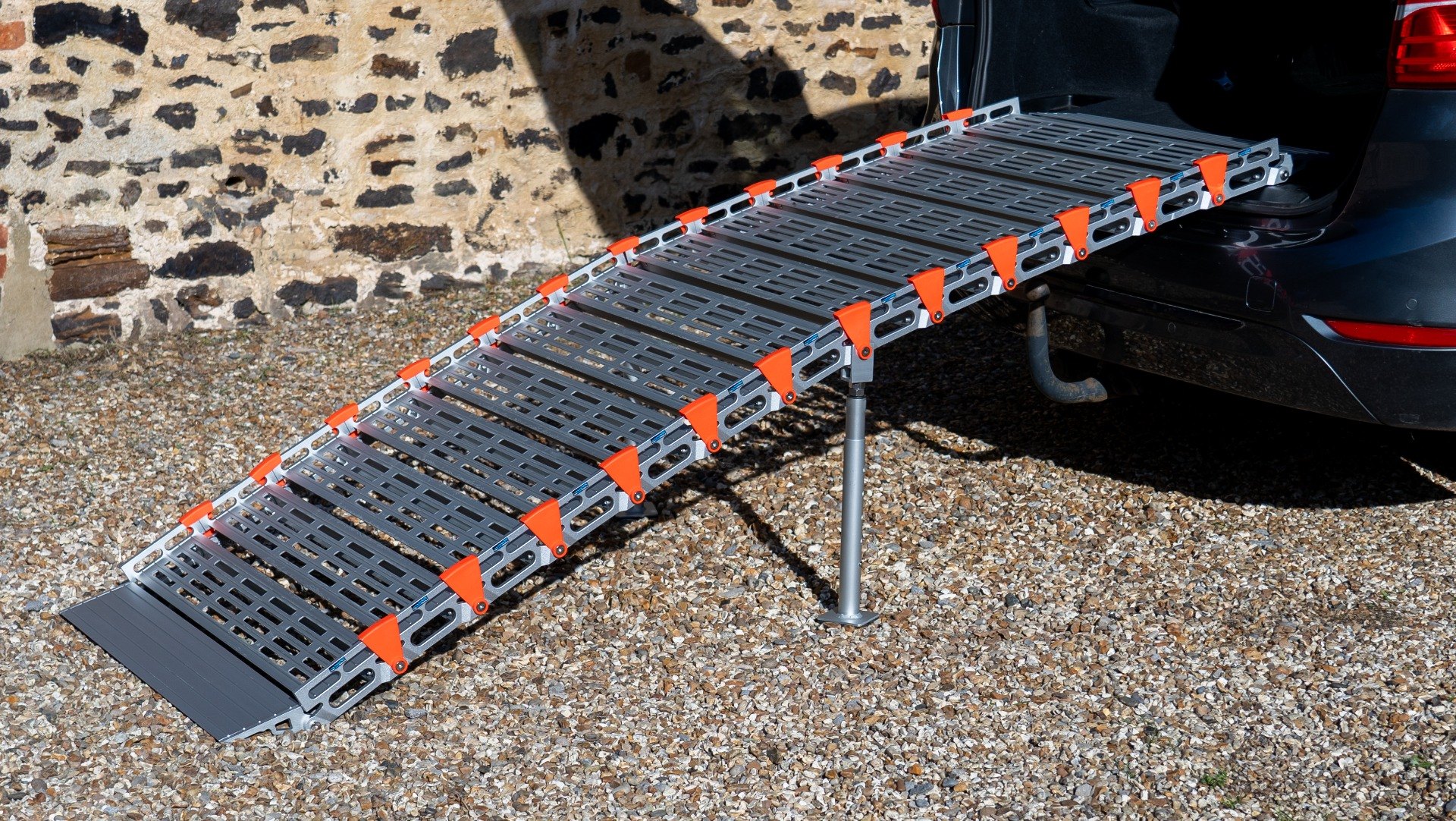 The ramp is modular and can be built to any length required. Use the Allen key to add or remove sections as needed, whether you want to shorten the ramp for lower steps, extend it to achieve a smoother gradient, or simply split it in half to make it easier to carry.