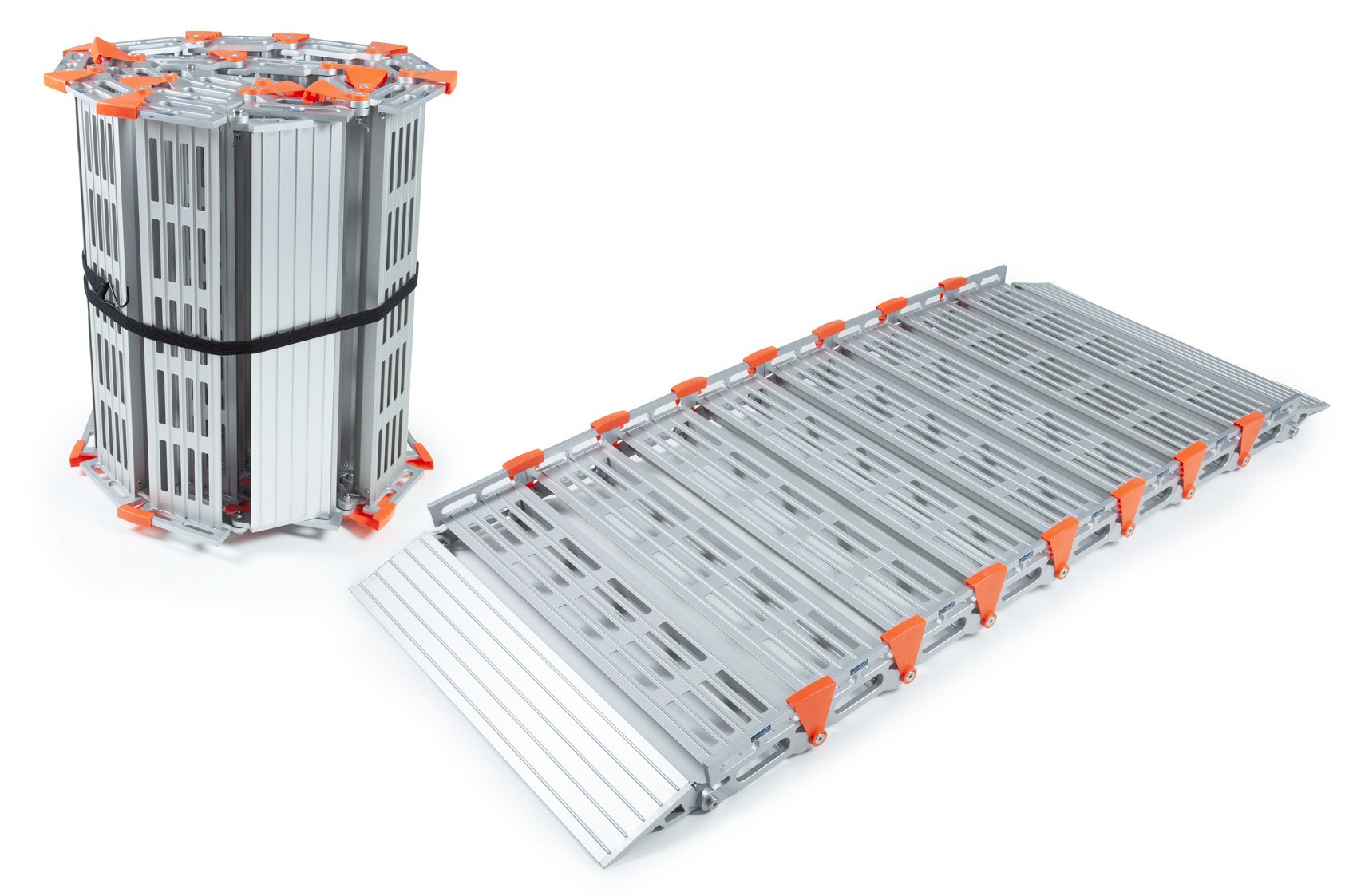 The portable ramp can be rolled for storage and transportation. Sections can be removed or added to reduce or increase the ramp length.