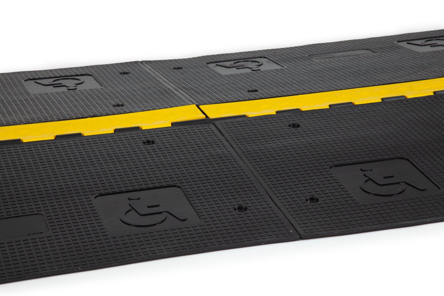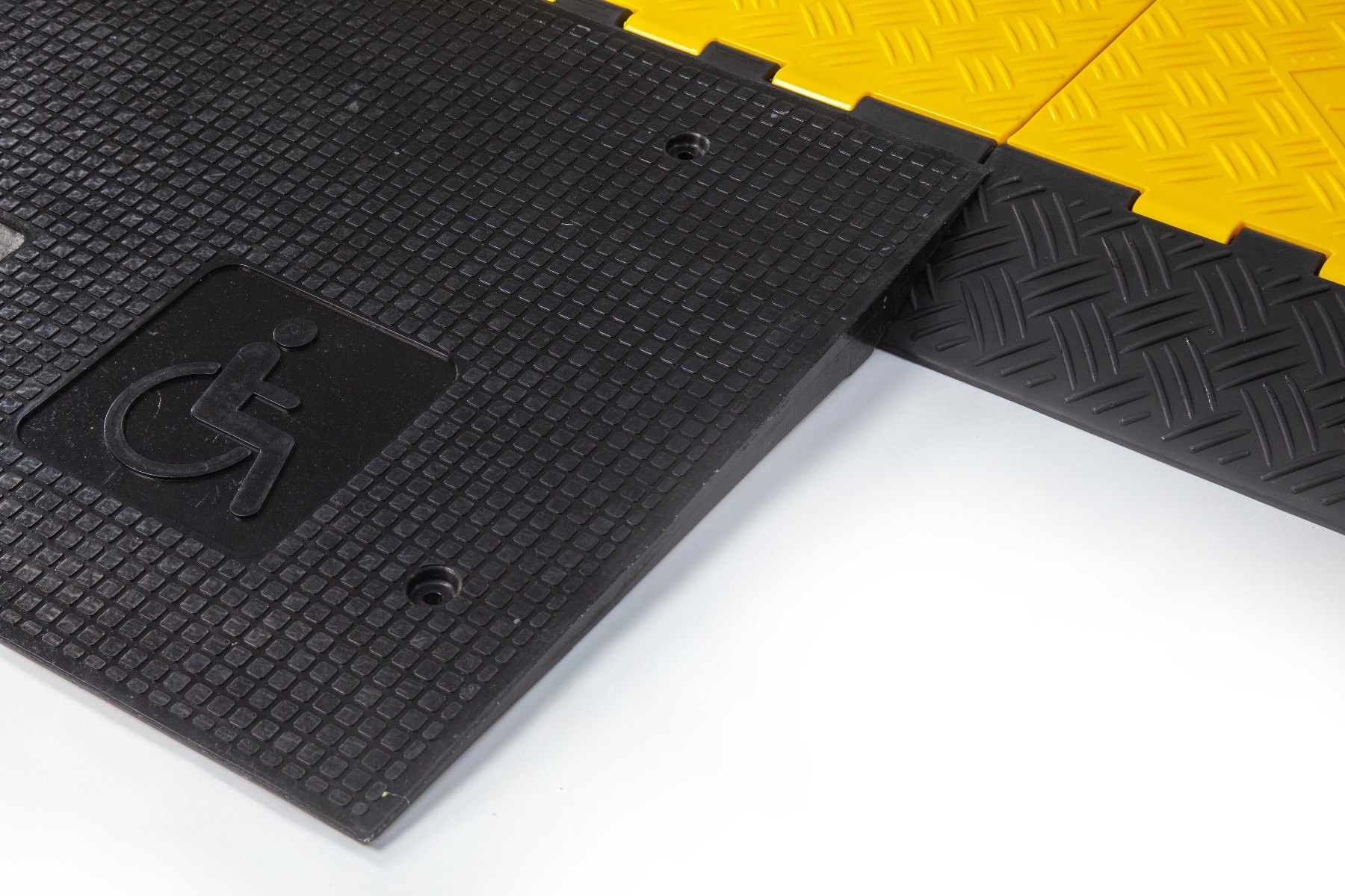 The rubber wheelchair ramp is designed to be used in conjunction with our heavy duty cable protectors. Simply rest the wheelchair ramp on the cable protectors to create a disabled friendly cable protector. Perfect for ensuring your pavement, event, festival, market or workplace remains accessible. The smooth gradient allows wheelchairs, pushchairs and items with low clearance to safely overcome the cable protectors.