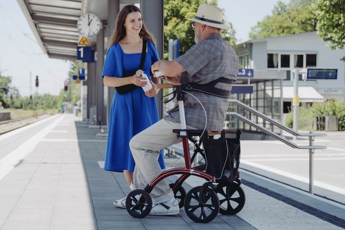 Designed in Germany, the premium heavy‑duty rollator offers armrests, a seat, a backrest, and shock‑absorbent handles for comfort. High visibility is built in, with over 30 reflectors, reflective tyre rims, and an integrated LED light for safe use at night. Ideal for outdoor use, the all‑terrain rollator features large puncture‑proof wheels with a rubberised tipping aid to help users navigate kerbs.