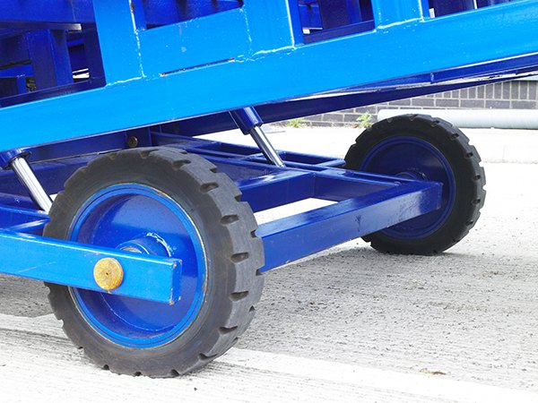 Forklift loading on to yard ramp Wheels on yard ramp Blue surface of yard ramp Blue grip surface on yard ramp Fixed swivel clamp on yard ramp Underneath of yard ramp and wheels CE certification mark on yard ramp Forklift on yard ramp yard ramp with handrails yard ramp with handrails
